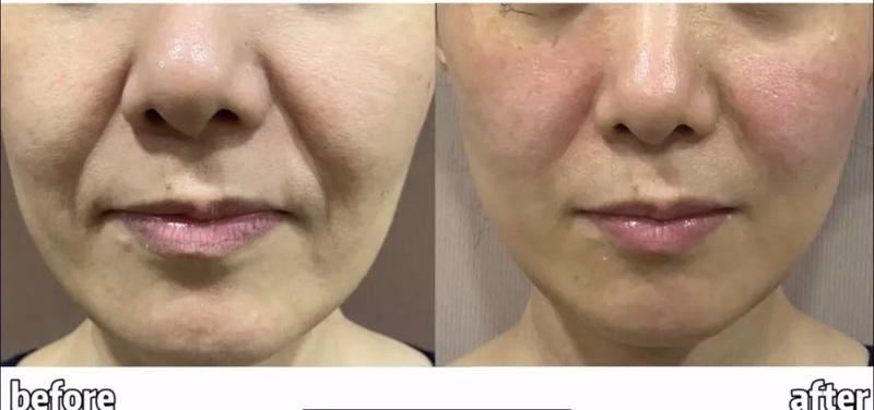 术中:先通过超声刀进行SMAS层加热收紧,随后用大分子玻尿酸立体填充法令纹基底,较后采用微量肉毒素放松颧大肌过度收缩。全程使用冷喷仪降低不适感,操作时长约90分钟。